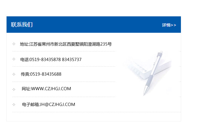 地址:常州市新北區友邦商務大廈1幢16、17層  電話:0519-85101652  傳真:0519-85112595  郵編:213022  網址:www.cz-jiayue_cn.sh-paisen.com  郵箱:xiajifengaa@163.com